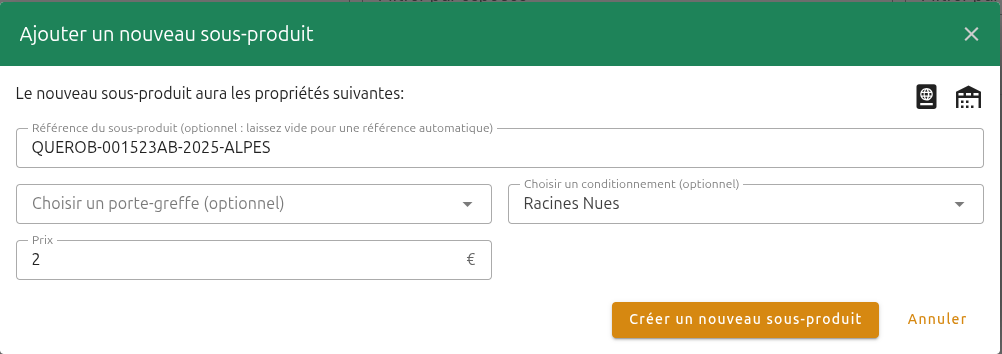 Il est également possible de créer un nouveau produit ou sous-produit. Lorsque vous créez un nouveau produit ou un nouveau sous-produit, certaines informations sont déjà pré-remplies à partir des informations du lot/mélange (espèce botanique, référence). Vous pouvez également configurer le mode de conditionnement :
