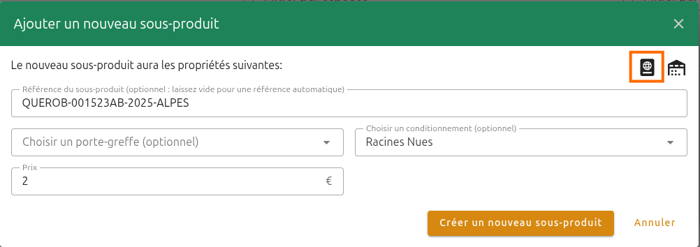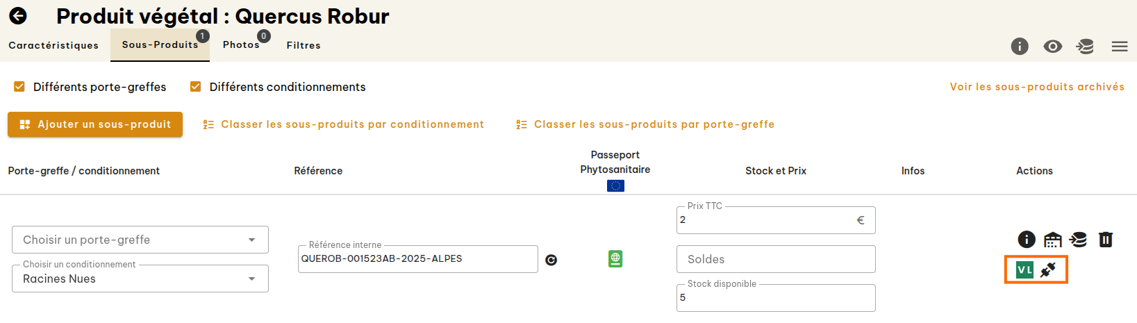 Il est également possible de configurer le passeport phytosanitaire du nouveau-sous produit en cliquant sur l'icône :
